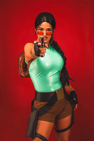 Lara Croft from "Tomb Raider" / Photo by Courtney Crawford / Wig, makeup and costume by me, SAFire Art / Guns, holsters and belt by Fan Fiction Props on Etsy / Top made by NimuesLatex on Etsy