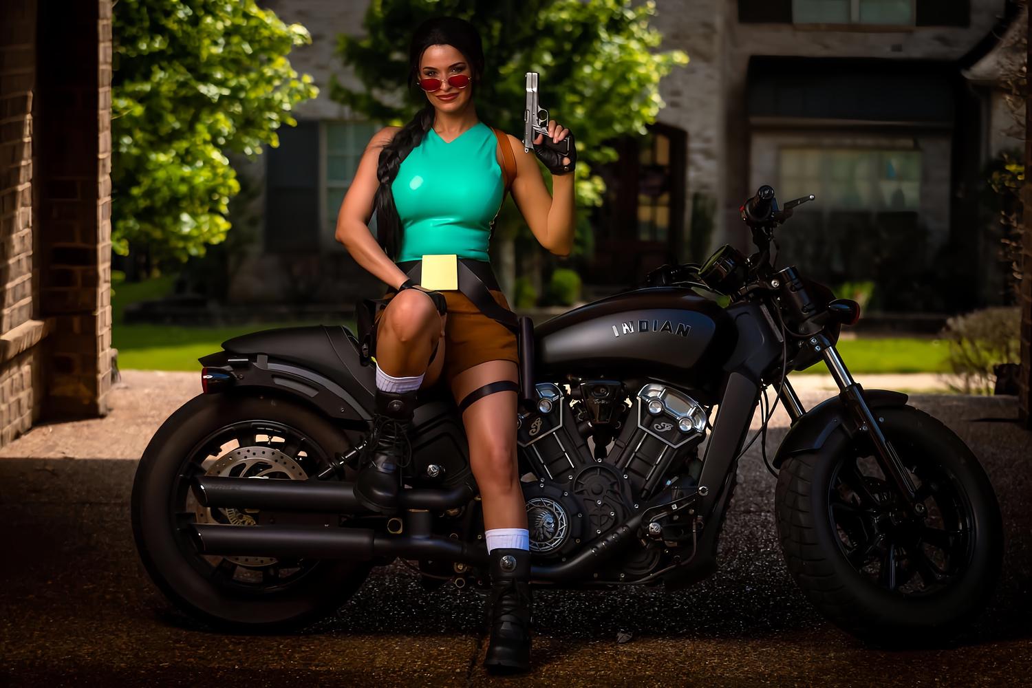 Lara Croft from "Tomb Raider" / Photo by Courtney Crawford / Wig, makeup and costume by me, SAFire Art / Guns, holsters and belt by Fan Fiction Props on Etsy / Top made by NimuesLatex on Etsy / Bike Provided by Chad Gray
